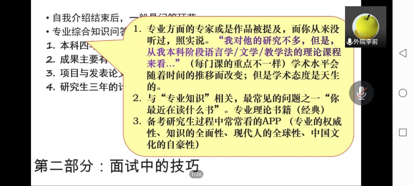 李前老师还对面试中可能出现的热点问题进行了总结,并提供了专业综合知识问题与第二外语类问题的答题技巧。向同学们分析了往年同学在面试中出现的一些问题,并鼓励大家要把握机遇。最后李前老师向大家讲解了面试过后的调整问题,同学们深受启发,就自身实际情况积极向李老师寻求意见与建议。李老师均悉心解答并在最后为同学们送上祝福,祝愿所有复试考生努力不被辜负,成功上岸!