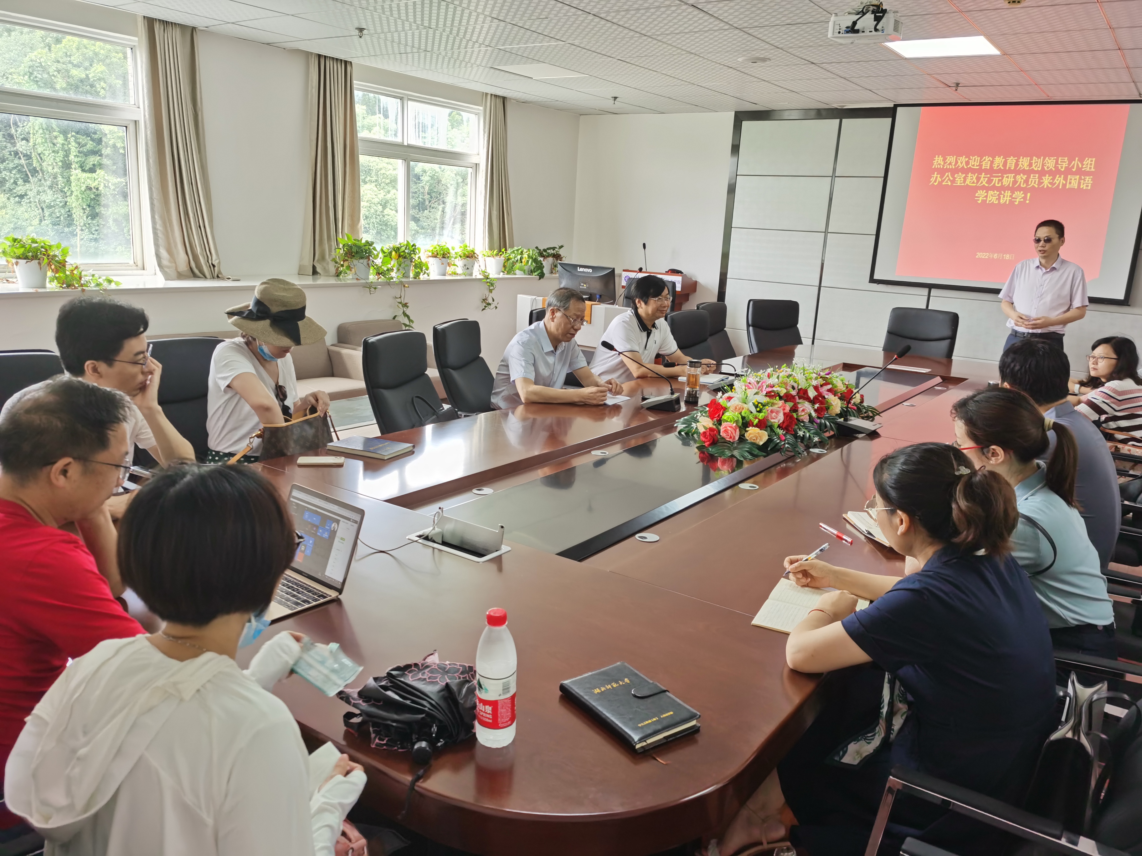 为提高外国语学院教师各级教育科学规划类课题申报能力,促进学院科研建设,6月18日上午,我院邀请湖北省教育科学规划领导小组办公室赵友元研究员,在翻译学研究中心21B604,作高水平教育科学规划类课题申报的专题讲座。本次讲座由副院长南潮教授主持。院长丰国欣和部分有项目申报意愿的教师聆听了本次讲座。