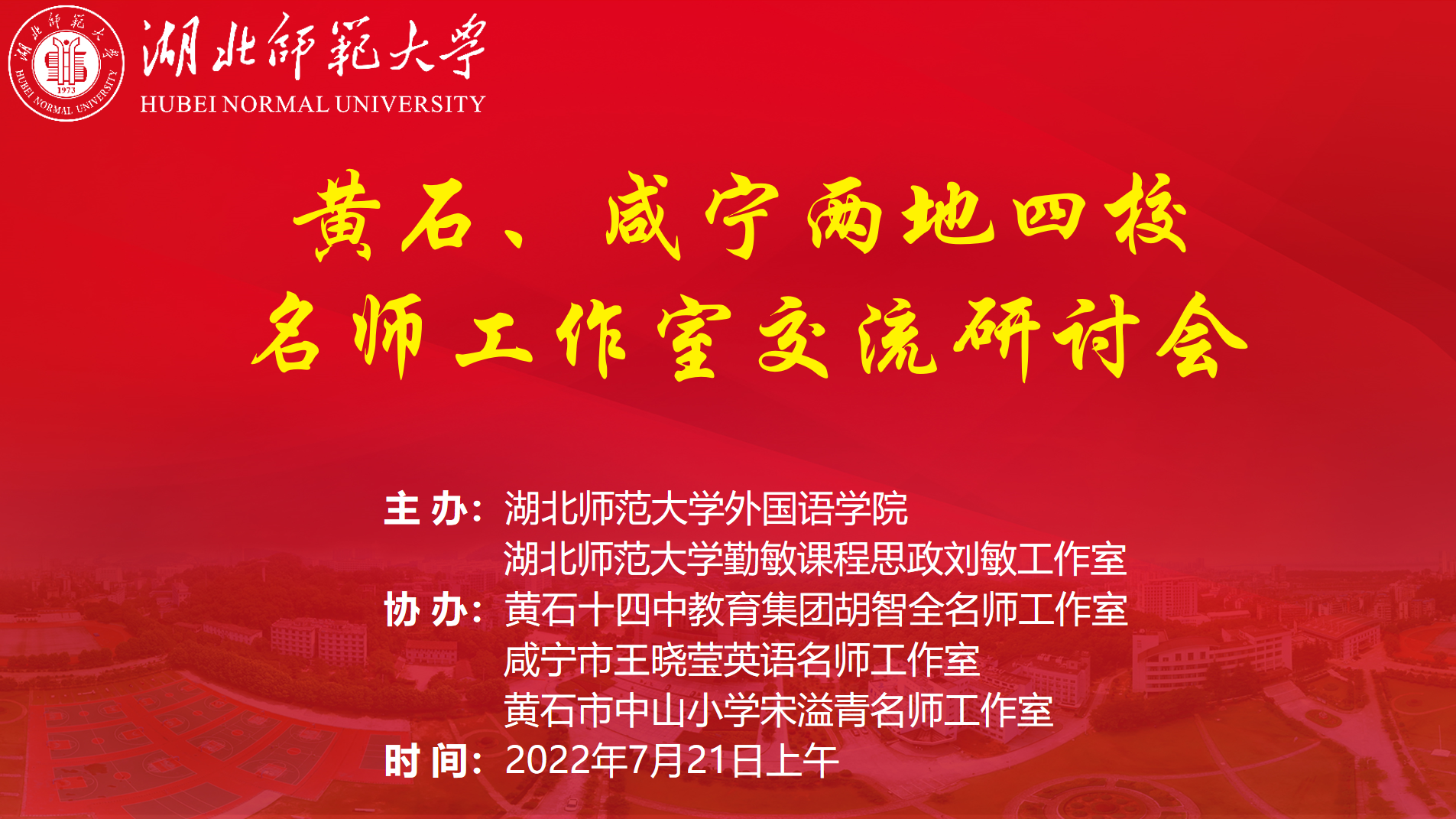 2022年7月21日上午,为深化高校与中小学合作共赢的“三位一体”协同培养机制,打造教师培养、培训、研究和服务一体化的合作共同体,实现高校名师工作室与基础教育中小学名师工作室的对接协作与深度交流,偷拍 在充分发挥国家级课程思政教学名师团队刘敏工作室“走出去”省内省外辐射示范作用的同时,将黄石、咸宁两地中小学英语名师工作室“请进来”,于人文楼21B602圆满举办“黄石、咸宁两地四校名师工作室交流研讨会”,旨在促进黄石、咸宁两地英语教育教学相互交流和同步发展,加强各名师工作室之间的合作学习与智慧共享。