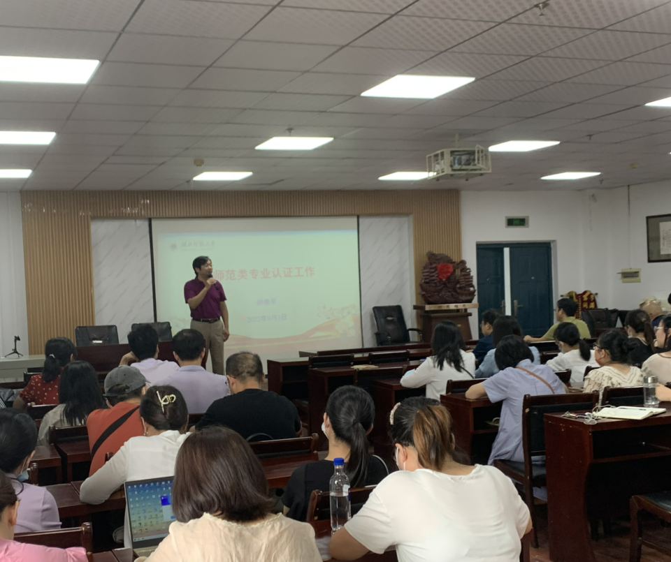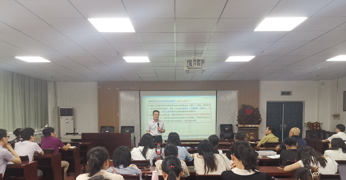 会上,胡艳军处长从师范类专业认证的重大意义出发,对比本科教学工作审核评估与师范类专业认证的不同,解读了专业认证的内涵及政策依据。他从师范类专业认证理念“以学生中心、产出导向、持续改进”为主线,深入浅出地引出了学校申请师范类专业认证前要做的准备工作。胡处长从培养目标、 毕业要求、课程与教学 、合作与实践、师资队伍、支持条件、质量保障、学生发展八个方面逐条逐项地讲解和分析了师范类专业认证的八大指标体系,对专业自评自建工作进行了深入指导