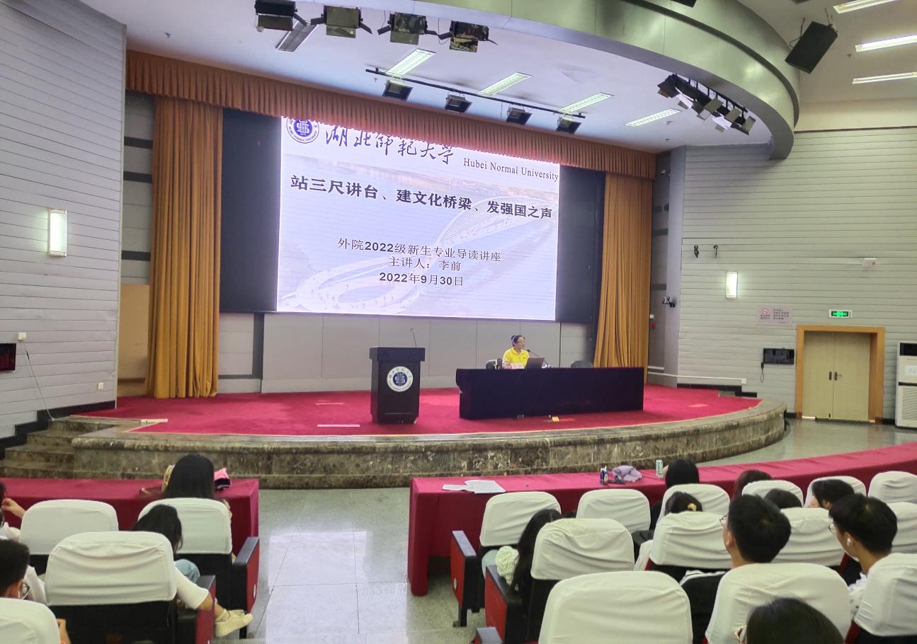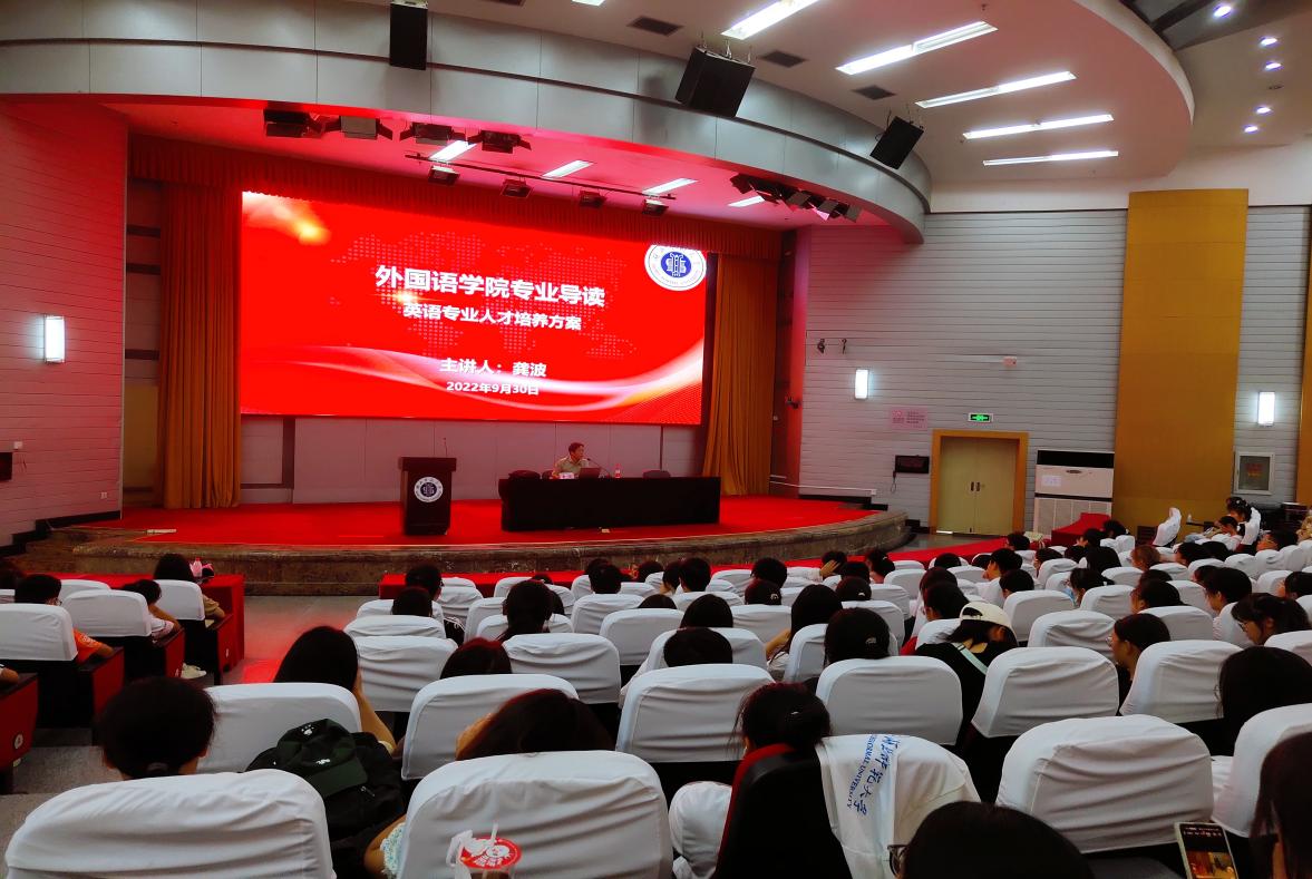 2022930日下午2:30,偷拍 在教育大楼报告厅召开线下2022级英语专业导读专业讲座。偷拍 副院长龚波、偷拍 副教授李前老师与22级英语专业新生参加,会议由辅导员罗兰主持。