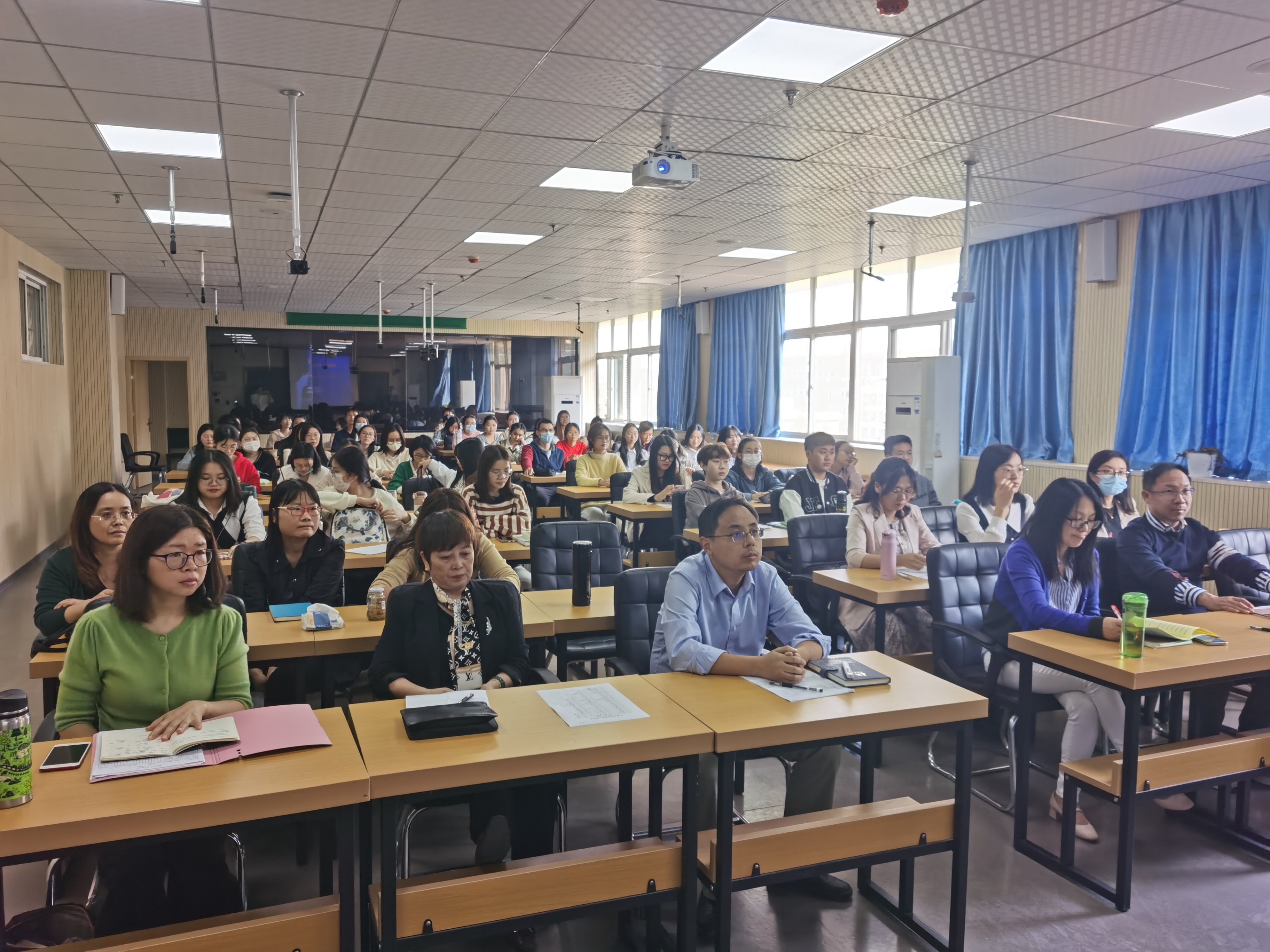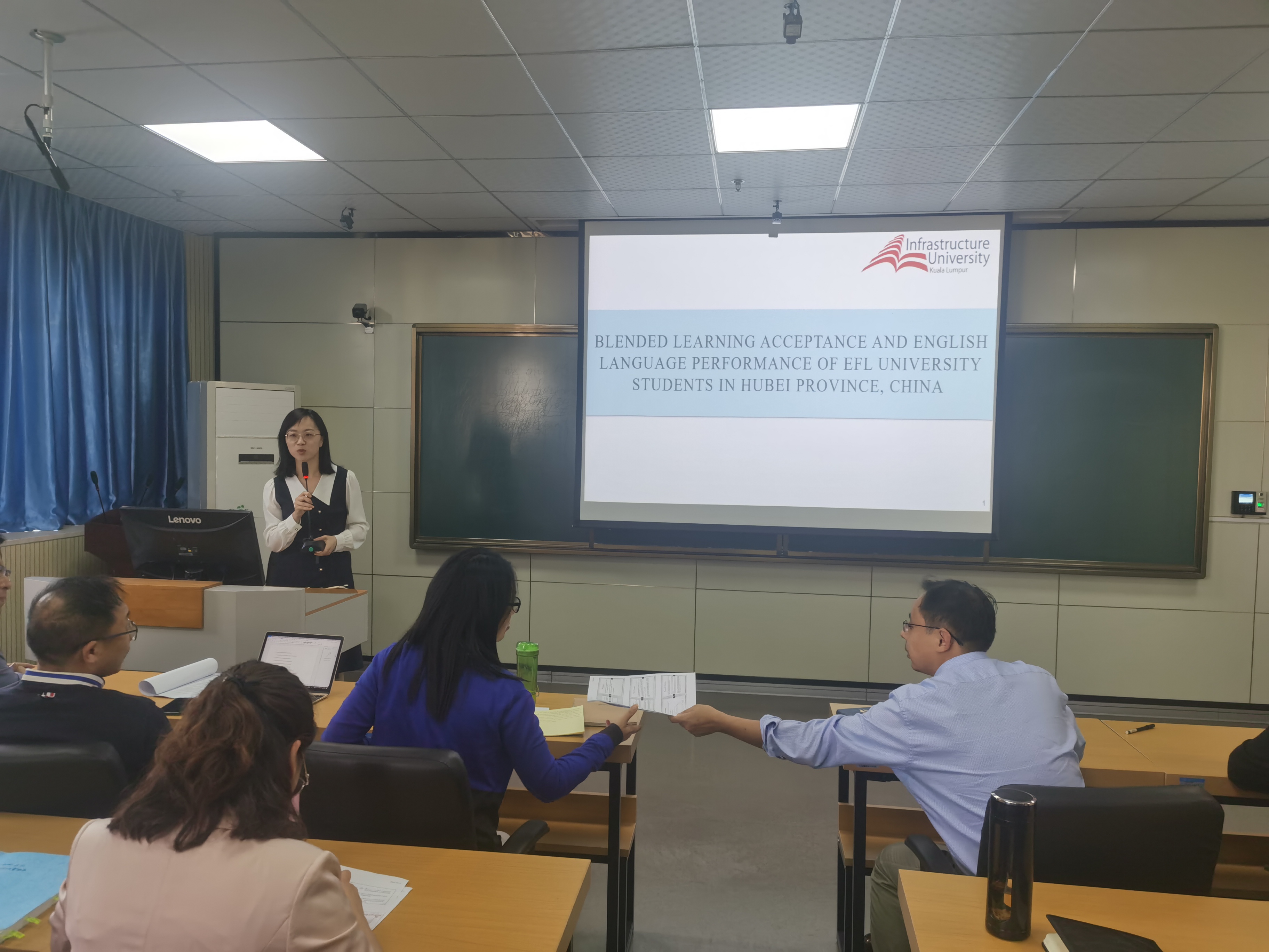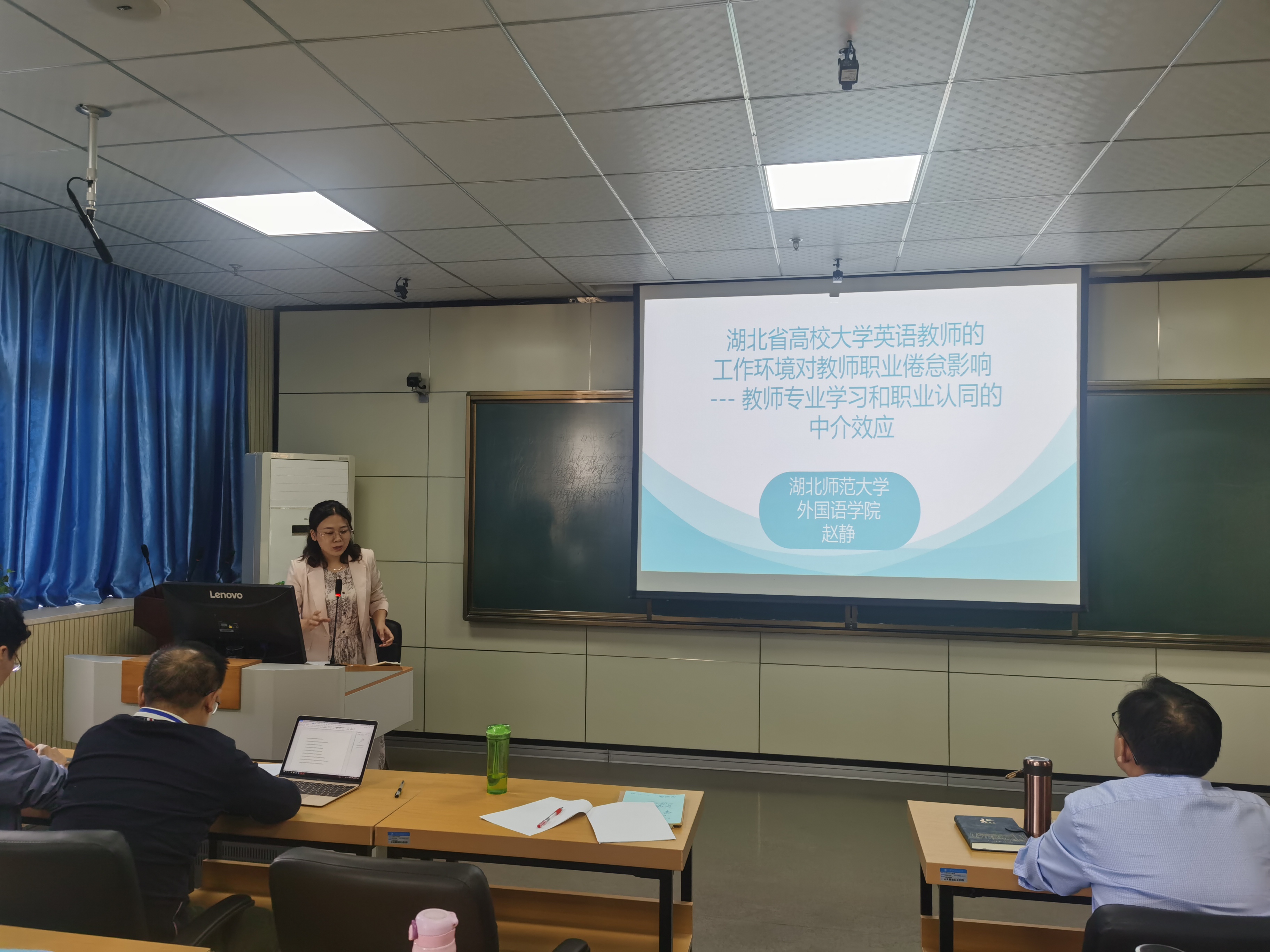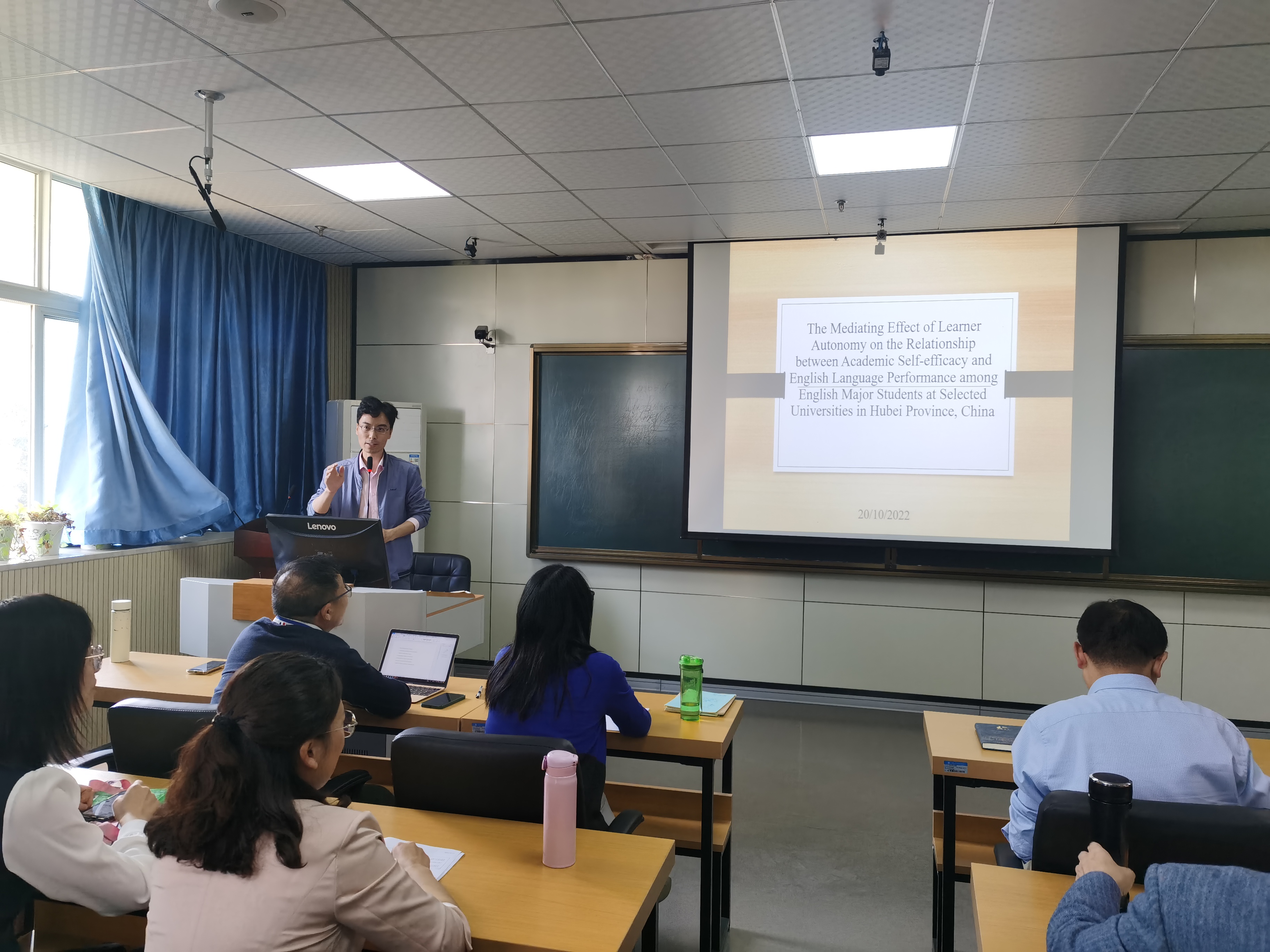 外国语言文学及应用语言学分会场由副院长南潮教授和英语系主任朱勇进副教授主持,英语系全体老师及部分研究生在21B602共同聆听了本次汇报。朱勇进博士以慕课背景下中国大学生英语学习效能、英语成绩,自我调控为主题,为大家介绍了其博士毕业论文写作背景,主要框架及写作体会。董志浩博士的汇报围绕自我调节训练对英语专业学生阅读能力的影响,指出学生阅读能力概念的界定及影响因素,让我们了解到自我调节训练的作用。赵静博士以高校大学英语教师职业倦怠现象为主题,讲述了其选题的目的以及写作过程中如何细化到本研究的自变量和因变量的过程。王璐博士的汇报内容充实,逻辑缜密,使在场师生学习到混合式学习相关的理论价值及实际操作经验。