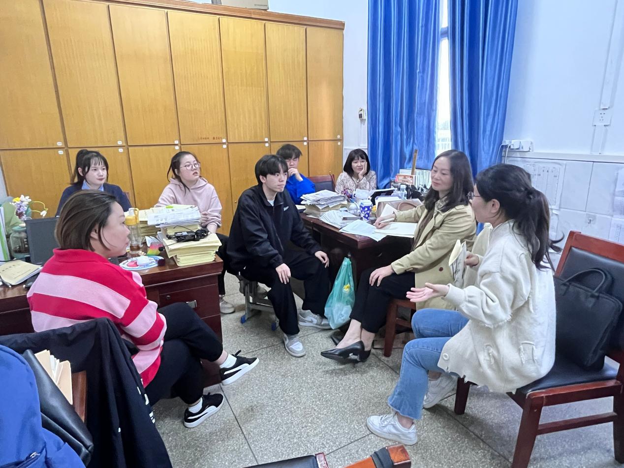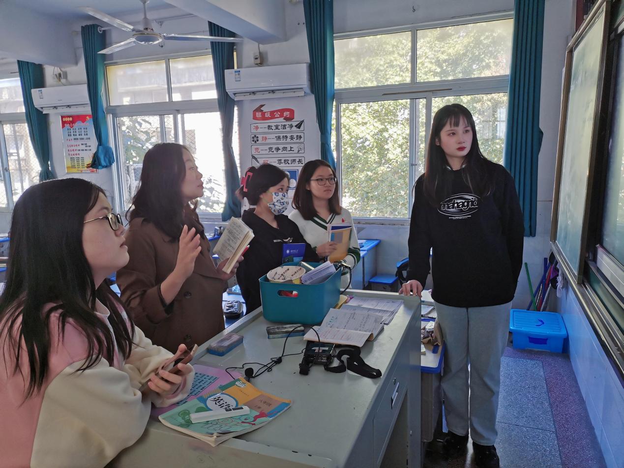 实习指导教师唐凤华与实习生探讨课例教学设计