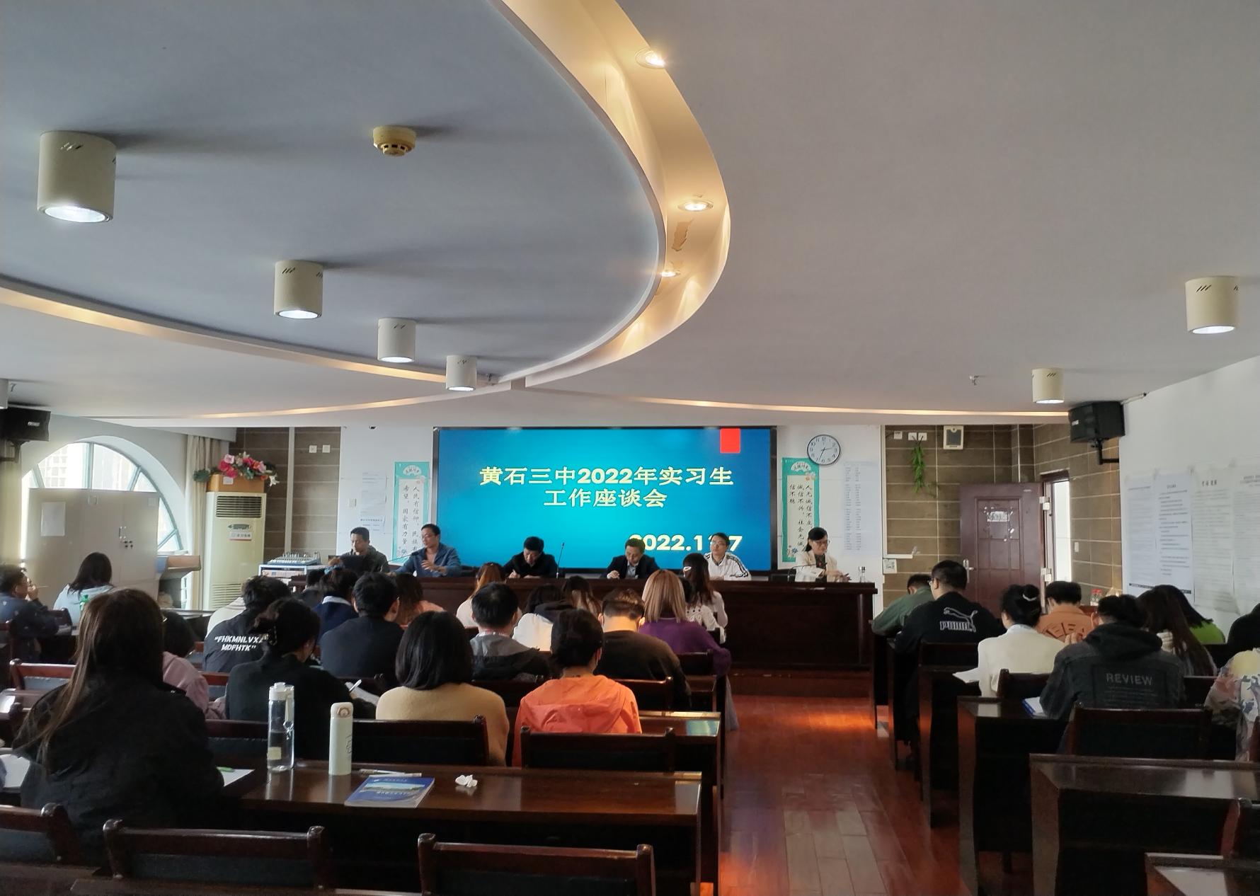 11月8日下午两点三十分,偷拍 英语系主任朱勇进、学工办主任黄志军前往黄石三中指导检查学生实习工作,并召开教育实习座谈会。黄石三中副校长赵虎、教务科研处副主任高雄风、英语教研组组长张红燕,全体2019级实习生参加了本次会议。会议由教务科研处主任罗威主持。