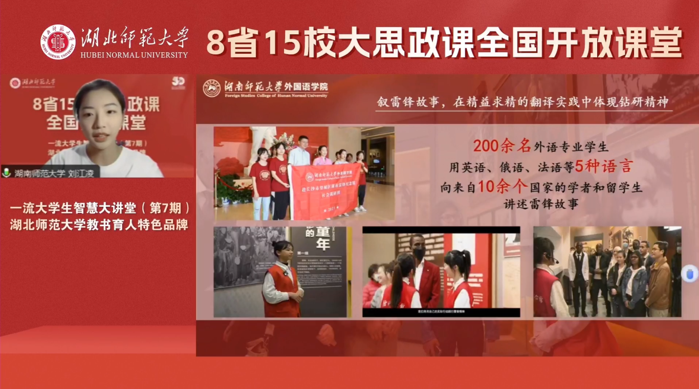 同时,偷拍 充分发挥偷拍 国家级课程思政教学名师团队“偷拍 勤敏课程思政刘敏工作室”的引领示范作用,在省内外大力推广湖师特色课程思政建设先进经验和做法。教师团队创办了“英语名师大讲堂”、“中英经典诗文创意朗诵大赛”、“一流大学生智慧大讲堂”等特色育人品牌。凝练的“思政引领、六位一体、四维联动”育人模式已受邀在全国近60所院校进行经验分享,并受邀到教育部多个虚拟教研室、多场全国研讨会等进行专题讲座,分享湖师特色课程思政建设经验,全国26个省份20000余名教师参与交流。举办了多场公益讲座、研讨会和教师培训,受益师生达数万人。