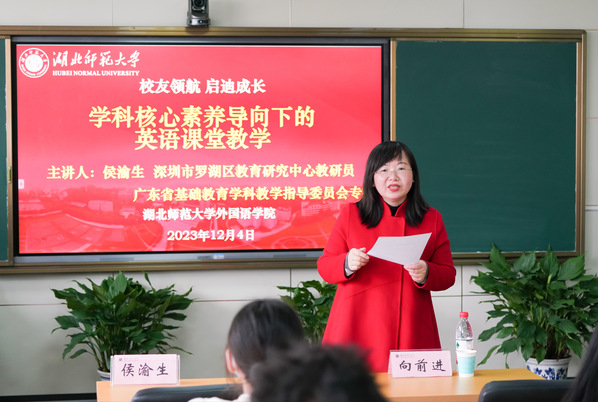 讲座分为两个部分,侯渝生教授以风趣幽默的语言为“学科核心素养导向下的英语课堂教学”主题讲座开场,他向同学们阐明了当前中国英语教学中存在的问题以及面临的困境,并分析了问题出现的原因以及有效应对和解决的办法。侯教授提出把中文对照教学从英语教学中分离,增加小组活动讨论,鼓励学生自我发现,自我探索,自我学习,增强英语学习兴趣,也为探索英语学科教学的创新发展路径提出了积极可行的建议。