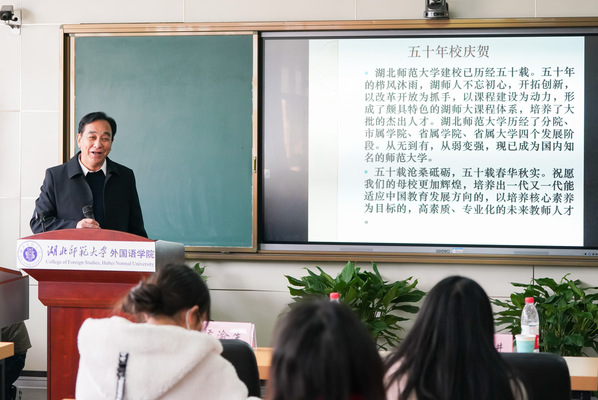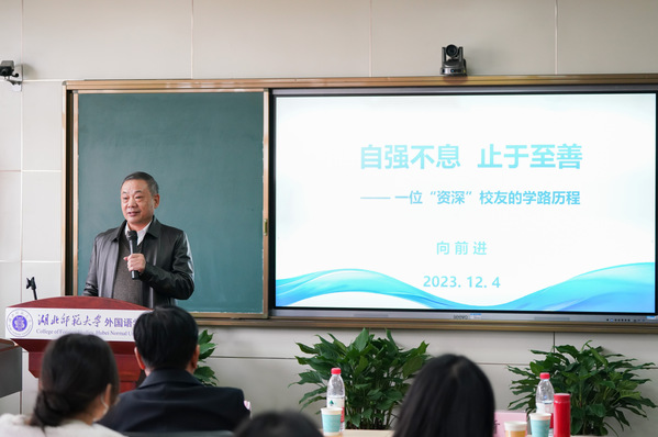 向前进教授则以“自强不息,止于至善———一位资深校友的学路历程”为题,与同学们进行了一场老师与未来老师间的对话。向教授以自身经历为例,为同学们讲述了在那个年代求学的困难与艰辛,强调英语教学过程中要因材施教,并注重英语基础的夯实,提高学科素养,让英语学科专业课程的教学效果和成果得到提升与突破。