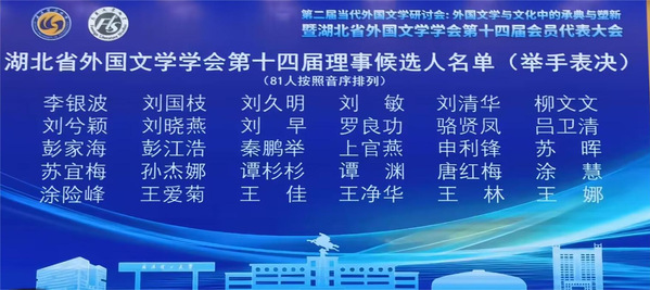 12月9日至10日,《外国文学研究》编辑部、湖北省外国文学学会和武汉理工大学偷拍 联合举办了第二届当代外国文学研讨会暨湖北省外国文学学会第十四届会员代表大会。9日下午举行了开幕式,并进行了换届选举,成立了新一届理事会,我院院长刘敏当选为湖北省外国文学学会第十四届理事。