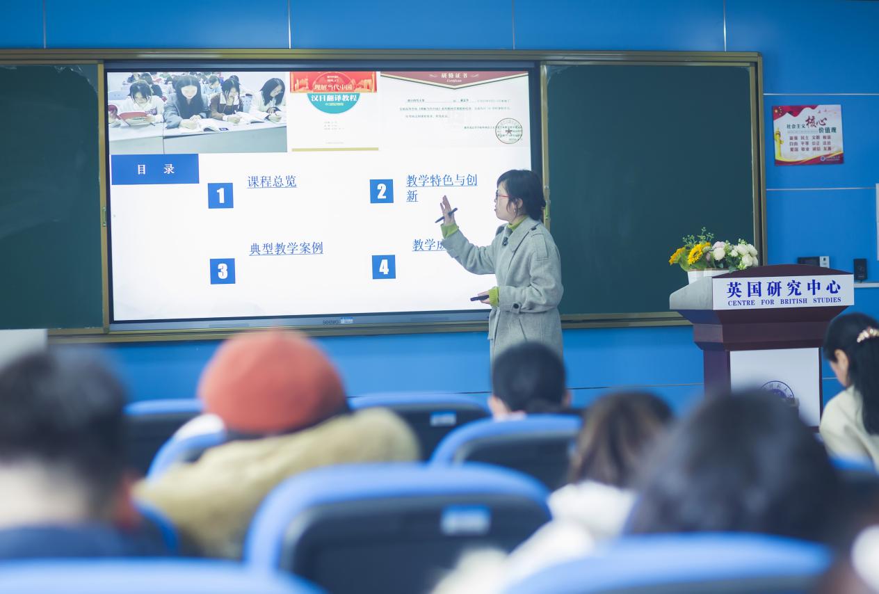 汪俊老师分享了在《商务汉英翻译》课程中《理解当代中国》教材的融合式教学情况。根据商务英语专业的特点,有机选取涉及翻译理论和时政文献语言特征的核心章节,以小组合作的形式,开展多元化主题的翻译实践活动,人才培养和课程建设成效显著。