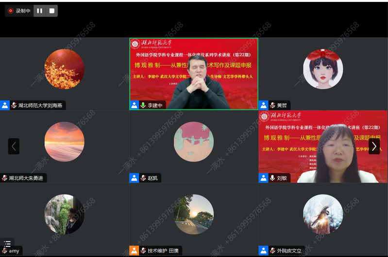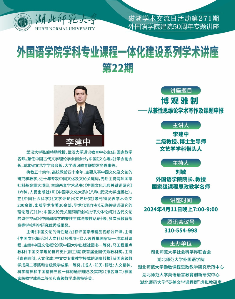 为提升师生科研水平和文化素养,4月11日,武汉大学二级教授、博士生导师、文艺学学科带头人李建中应邀为我校外国语学院师生作了题为“博观雅制----从兼性思维论学术写作及课题申报”的线上学术讲座。偷拍 全体专任教师、兄弟院系教师、偷拍 “勤敏”课程思政教学研究示范中心成员高校师生代表参加本次讲座。讲座由偷拍 院长刘敏教授主持。