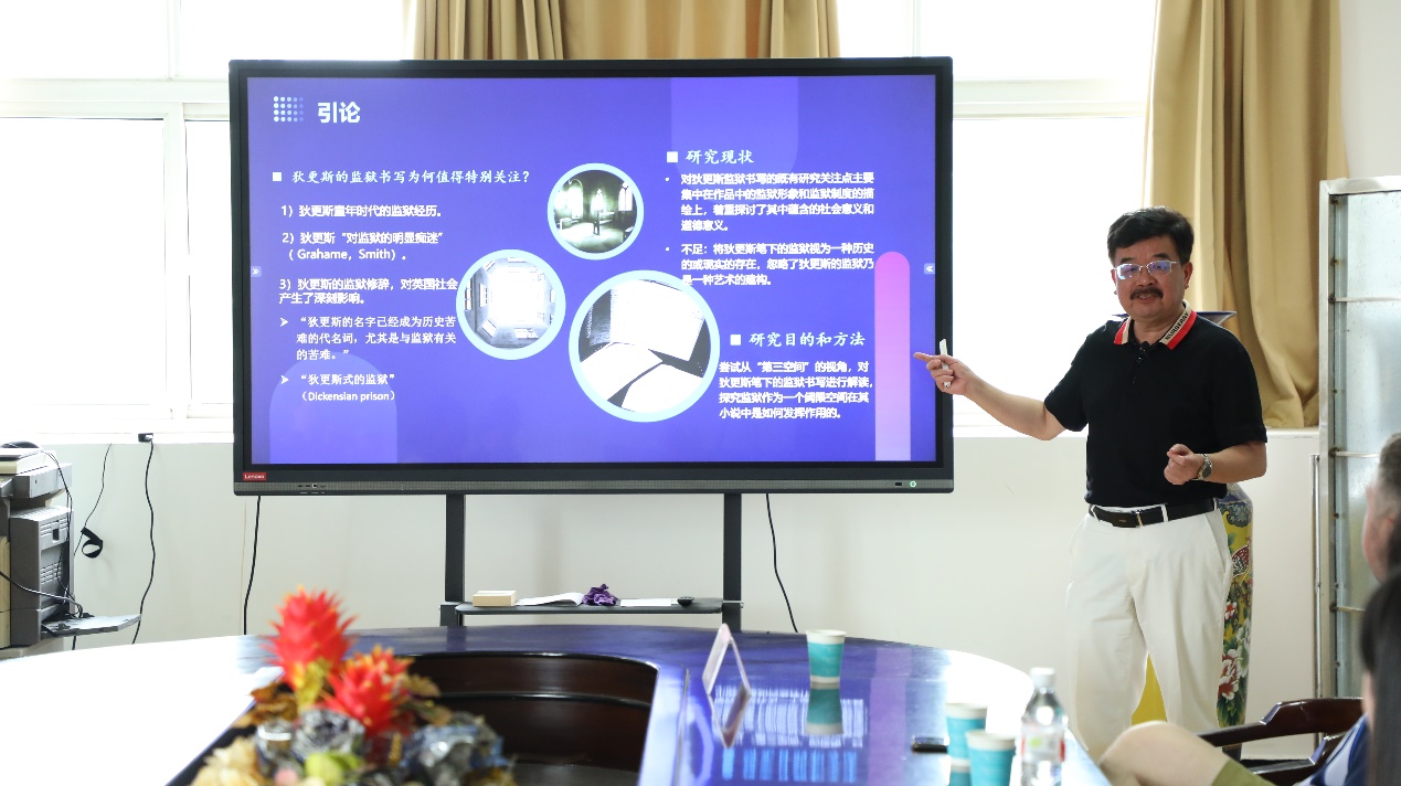 2024年5月20日上午,偷拍 举办的第24期学科专业课程一体化建设系列学术讲座在人文楼21b511如期进行。讲座邀请了华中科技大学人文学院院长刘久明教授主讲,由偷拍 院长助理朱勇进老师主持。偷拍 众多本科生、研究生共同聆听了此次讲座。接续去年讲座关于狄更斯小说中的厌食症想象与身体政治的探讨,刘久明教授继续带领大家深入“第三空间”视域下狄更斯监狱书写的再阐释这一主题。