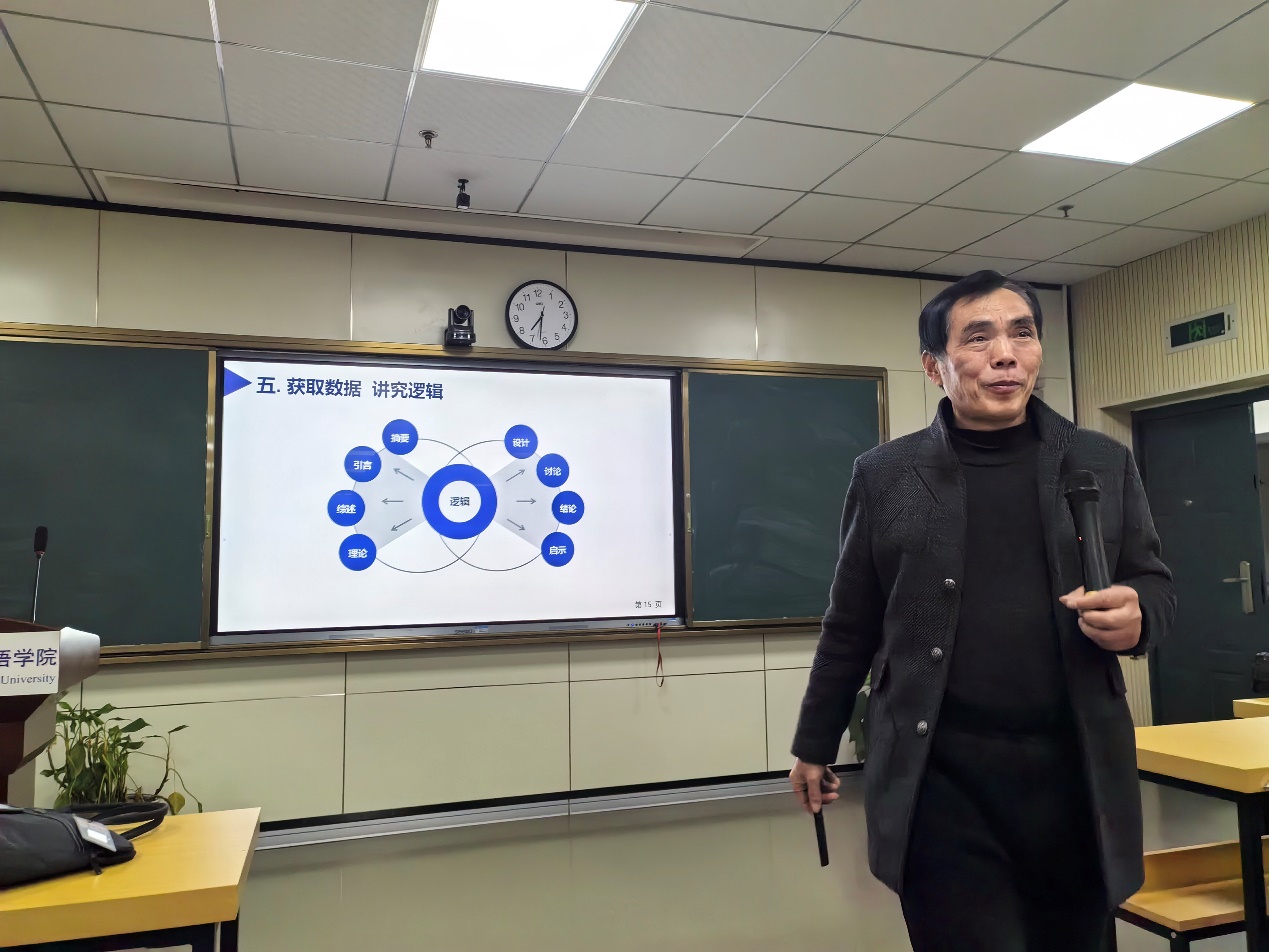 讲座伊始,高教授根据自己多年经验列举了研究生论文写作中普遍存在的问题,即思辨能力不足。接着开展了问题驱动下的经验分享:首先,高教授从不同的视角给学生提供了一些毕业论文选题的典型案例,涵盖教师课堂研究、英语教材研究、英语考试研究等方面。其次,高教授详细解读了几种常见的毕业论文的研究类型:调查研究、实验研究、案例研究、文本研究等,针对不同的研究类型如何匹配合适的研究方法。然后,高教授从论文的研究问题入手,讲解了如何精准界定论文的研究问题,如何围绕研究问题进行文献综述、研究设计、研究讨论和结论回应等,给出了一些翔实可操作的建设性意见。最后,高教授以自己平常的指导为例,详细解读了论文中不同章节的撰写逻辑。