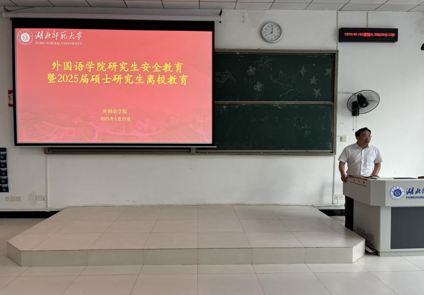 2025年5月25日上午8:00,偷拍 于人文楼21AT05教室召开研究生安全教育暨2025届毕业离校教育专题会议。副院长项军平、辅导员黄志军及外院全体研究生参加,会议聚焦安全警示与离校服务,助力毕业生平稳开启新征程。