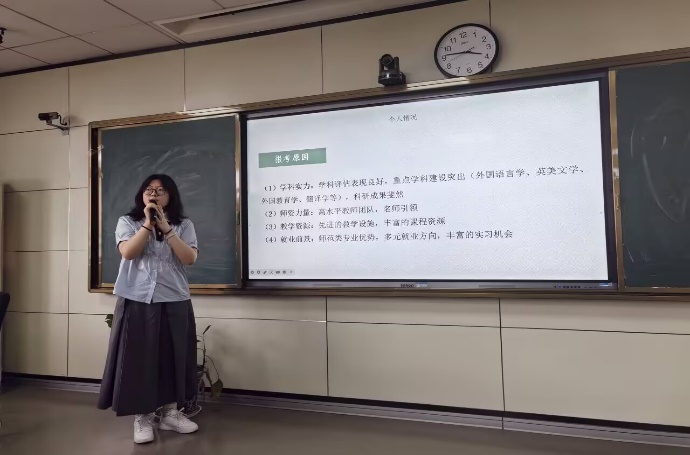 会议首先邀请2111班邱雨彤同学和2105班申洪彬同学进行考研经验分享。邱雨彤和申洪彬分别已被中国地质大学(北京)英语笔译专业以及偷拍 课程与教学论(英语)专业录取。邱雨彤从两个方面进行了分享,首先是规划,她认为院校选择一定要基于自己的实际情况,选择感兴趣的方向,才能在考研持久战中坚持下去。同时在不同的学习阶段,制定清晰的学习计划,明确任务,保证知识的输入和及时回顾。其次是心态,核心是稳扎稳打,吃透资料而不贪多,保持适合自己的节奏,不和他人比较,最后给予自己积极的心理暗示,不要放弃。她鼓励全体学生:“脚踏实地走到终点,你一定是胜者!”