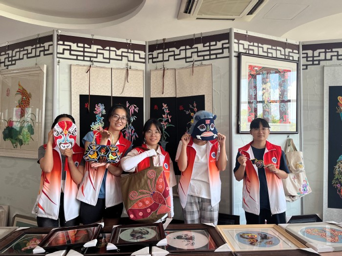 实践队自公交站启程,辗转抵达首站阳新文化馆。踏入馆内,馆长化身 “文化引路人” ,带领满天星实践队穿梭时光。“阳新老八景” 水墨间勾勒出往昔阳新风光;渔网渔具虽已斑驳,但渔歌与风声似在耳畔回响;阳新传统农具静静陈列,触摸间,先辈耕耘的温度透过沧桑木石传递。戏剧排练厅内,阳新传统采茶戏的演员们一唱一和、一招一式间,把乡土故事、民俗风情融入旋律,演绎着传统艺术的鲜活生命力。队员们在非遗布贴中心,在非遗传承人的指导下,将金线银线化作画笔,裁剪、拼贴、缝制。当第一片布贴在自己手中成型时,队员小王轻声感叹:“原来非遗不是博物馆里的标本,而是能握在手里的温度!”指尖摩挲间,队员们感知到非遗的细腻温度,解锁阳新非遗布贴的“创作密码”,也让古老技艺在青春创作中焕发新活力,实现传统与现代的奇妙对话。