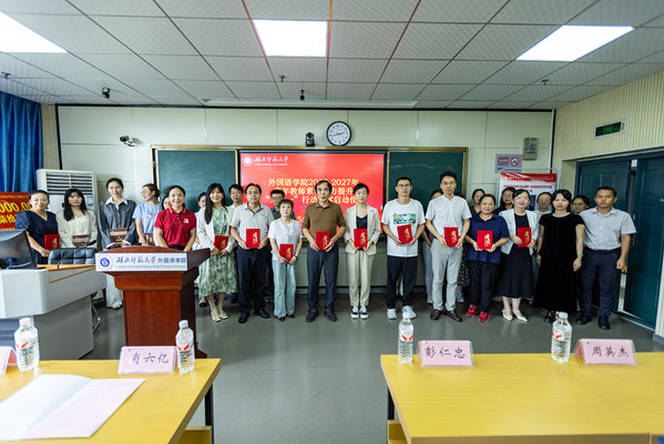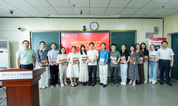 随后,肖六亿与人事处处长刘建民共同为14位青年教师赠送涵盖外语教学、科研方法的学术书籍,书籍承载着学校对青年人才的殷切期许,现场师生共同合影留念。