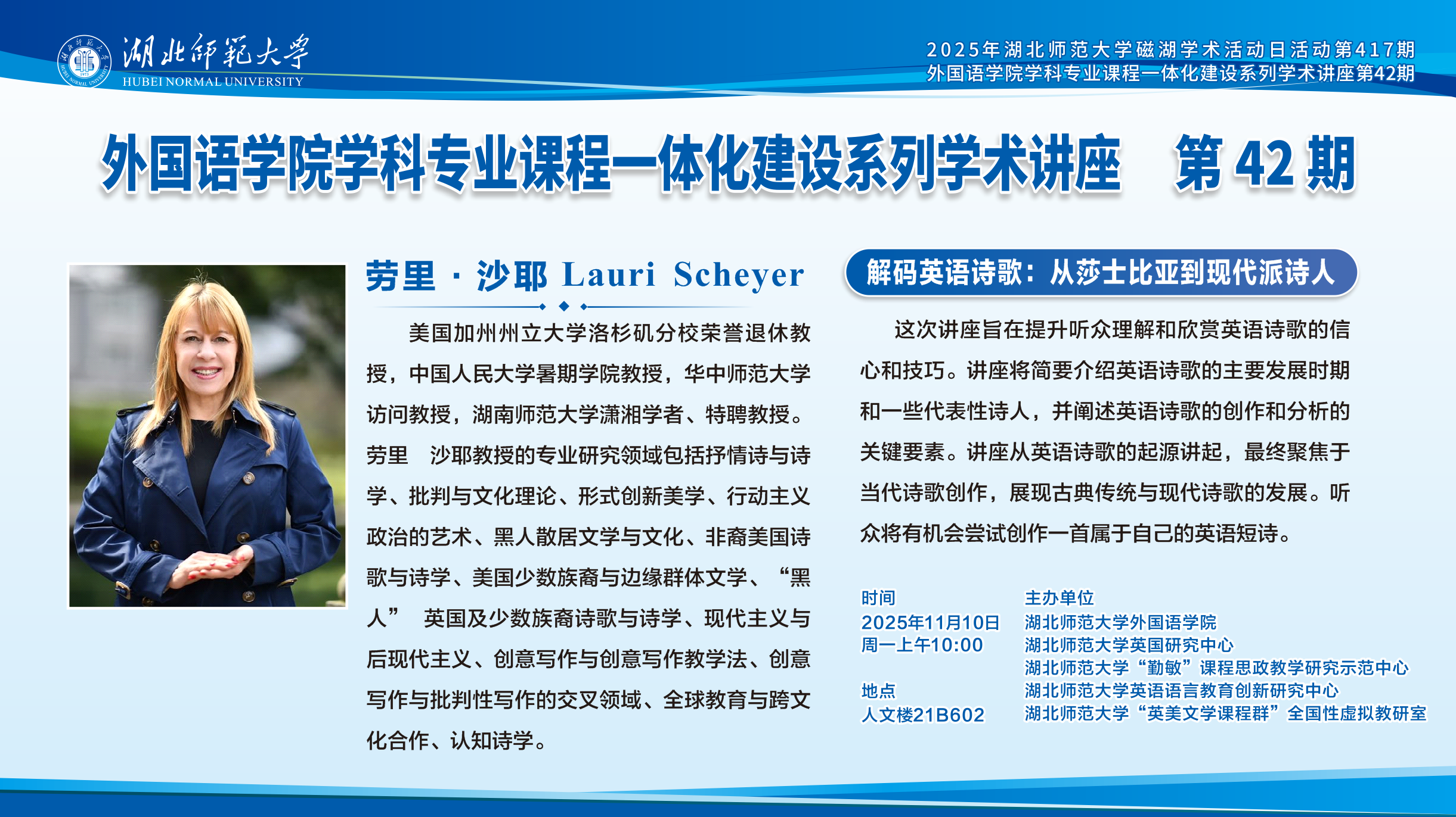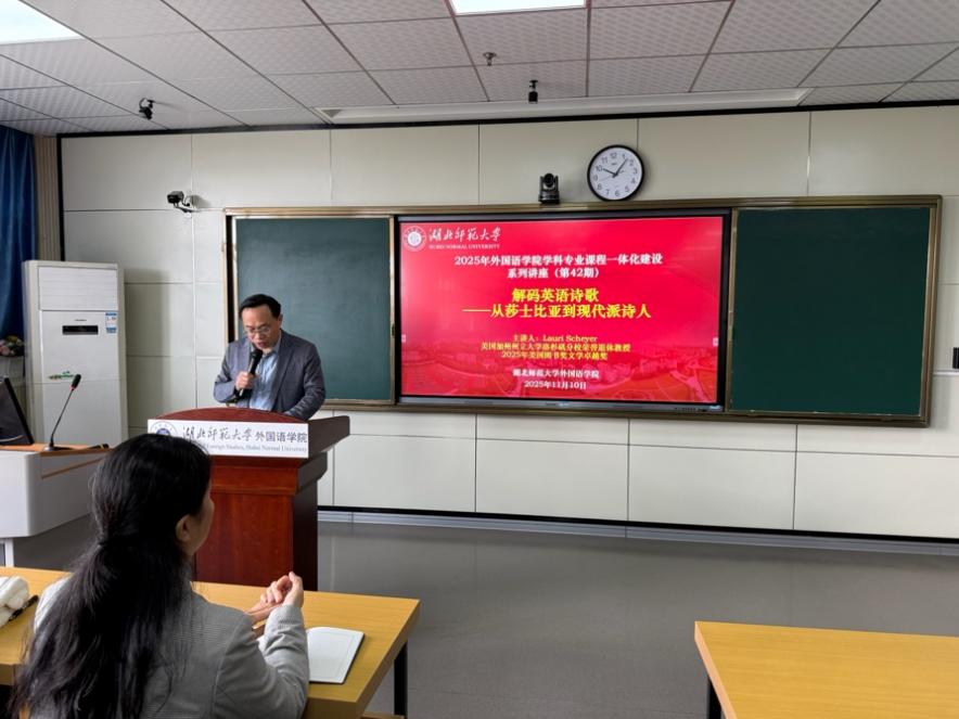 为深化学科专业课程一体化建设,拓宽师生学术视野, 11 10 日上午,偷拍 在人文楼 602教室成功举办第 42 期学术讲座。本次讲座邀请了美国加州州立大学洛杉矶分校荣誉退休教授劳里沙耶(Lauri Scheyer)主讲,主题为“解码英语诗歌:从莎士比亚到现代派诗人”。