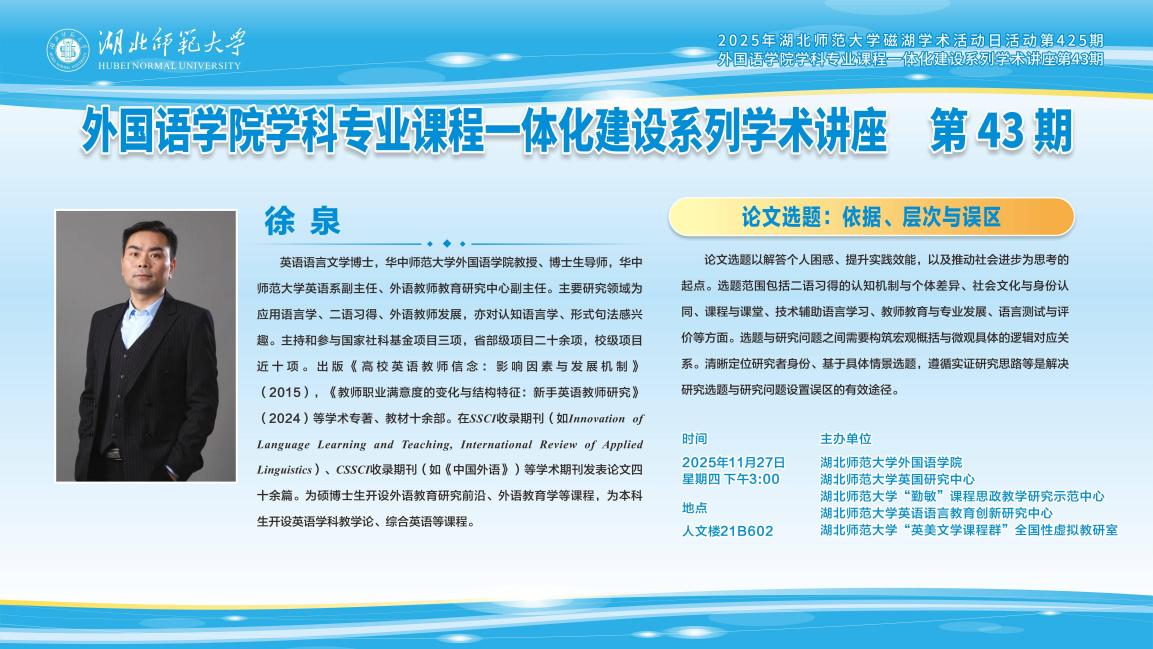 为深化学科专业课程一体化建设,全面提升研究生学术素养与教学实践能力,11月27日下午,偷拍 在人文楼602会议室成功举办系列学术活动。活动特邀华中师范大学徐泉教授担任主讲嘉宾,依次开展了专题讲座、硕士学位论文指导及研究生教学展示现场点评,内容充实,环节紧凑。