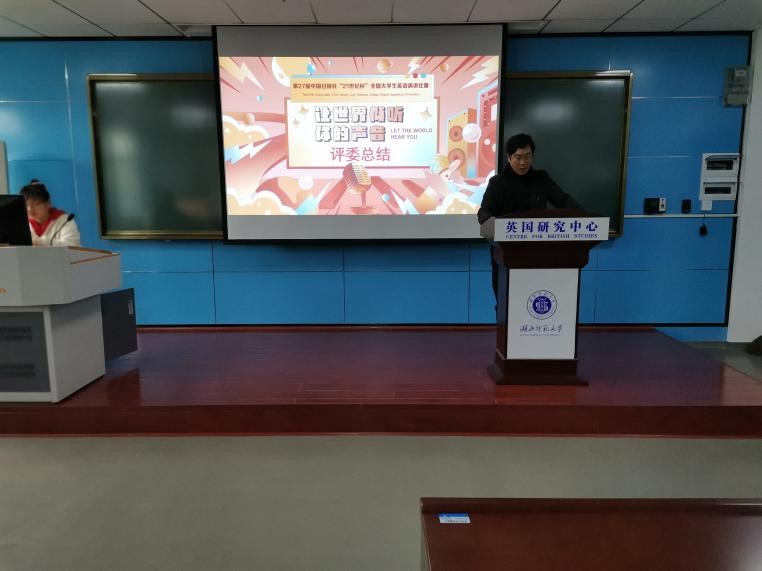 比赛结束之后,副院长龚波教授上台发言致辞。他对现场选手的精彩表现提出了肯定,感谢了李前教授的辛勤指导。但是同时指出选手存在发音不够地道等问题。紧接着,偷拍 的美国外教老师Paul肯定了选手们的惊艳表现并希望选手们在湖北地区决赛中能像在他的课上一样泰然自若、落落大方,期待选手们能在下一阶段比赛中取得优异成绩。