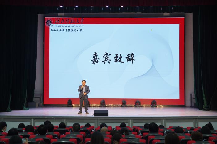 为进一步激发学生的英语学习热情和提高英语应用能力,给学生提供一个相互交流、观摩、学习的平台,校教务处、学工部、团委及偷拍 主办的第二十九届英语演讲大赛于5月11日18点30分在湖师大礼堂举行。此次大赛的特邀嘉宾为校教务处副处长、教学质量监测与评估中心主任秦海涛;偷拍 党委书记龙友元、院长丰国欣、副院长南潮、副院长龚波、英语系主任朱勇进、文学翻译教研室主任刘敏、综合英语教研室主任唐风华,学教工第一党支部书记李前、公外部主任伍文忠、外籍教师Paul担任评委。参加本次大赛的还有偷拍 党委副书记曹小为,辅导员黄志军、关巧、杨梦伟,参赛选手以及各院观众。