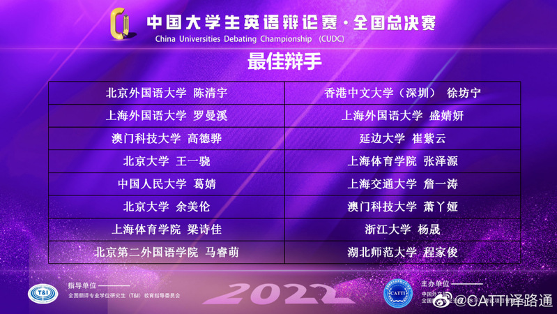 123-10日,2022年中国大学生英语辩论赛(CUDC)全国总决赛通过线上赛场举行。晋级本次总决赛的队伍来自北京大学、浙江大学、上海交通大学、复旦大学北京外国语大学等高校。