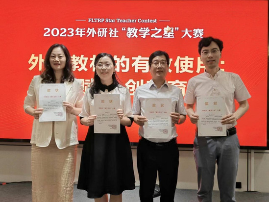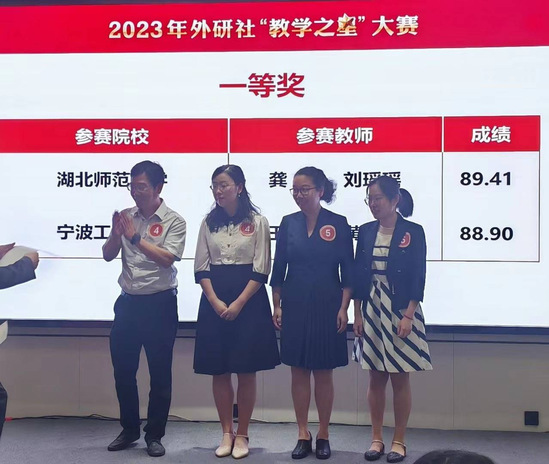 7月31日,倍受期待的2023年外研社“教学之星”大赛全国英语专业组半决赛在西安拉开帷幕。我院英语专业教学团队(龚波、刘瑶瑶、朱勇进、董志浩、唐凤华)作为省赛英语专业组特等奖团队代表湖北省挺进全国半决赛,现场协同合作、凝智聚力,最终以出色的表现,荣获全国半决赛英语专业组一等奖的好成绩。