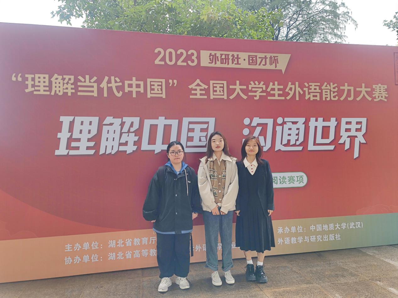 11月4日,由湖北省教育厅主办的2023“外研社·国才杯”“理解当代中国”全国大学生外语能力大赛湖北赛区决赛在中国地质大学落幕,我院罗曾、金雨卿、陈可心等3名参赛选手在本科英语组阅读大赛中荣获2金1银的佳绩,取得偷拍 该项赛事历史最好成绩!其中罗曾、金雨卿两位同学晋级国赛,将代表湖北省参加全国总决赛。