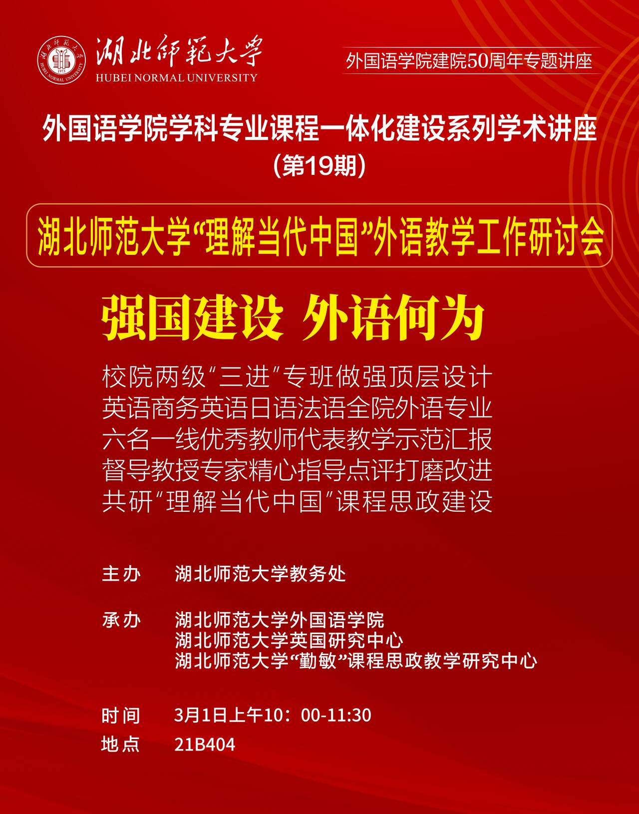 3月1日,偷拍 “理解当代中国”外语教学工作研讨会在人文楼21B404英国研究中心学术报告厅成功举行。偷拍 教学质量监测与评估中心主任、教务处副处长秦海涛、偷拍 党委书记王海燕、院长刘敏、副院长项军平、教务处教学督导高旭阳出席了本次大会。偷拍 “理解当代中国”系列课程全体任课教师,学院中青年专任教师代表参与了会议学习。研讨会由刘敏主持。