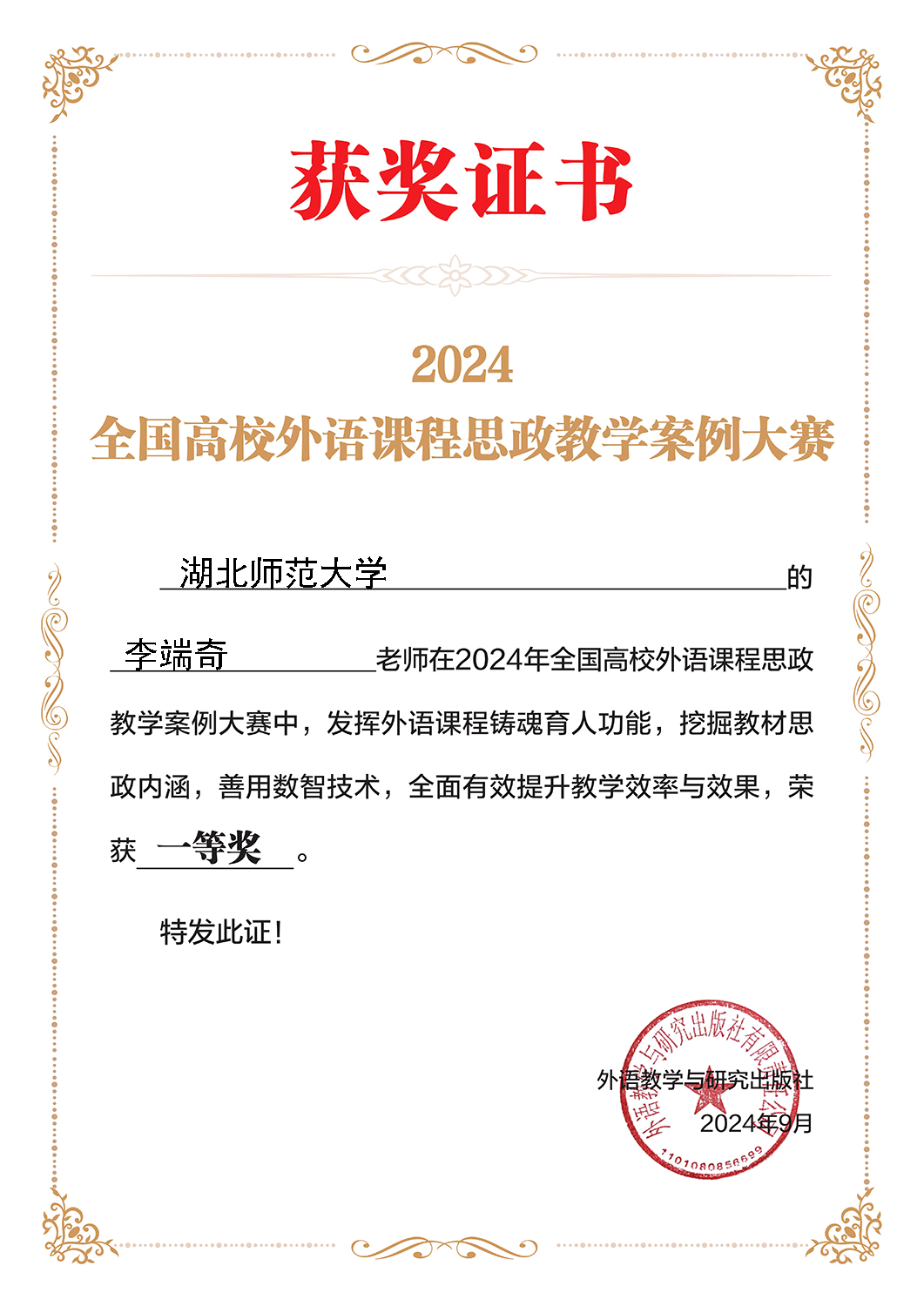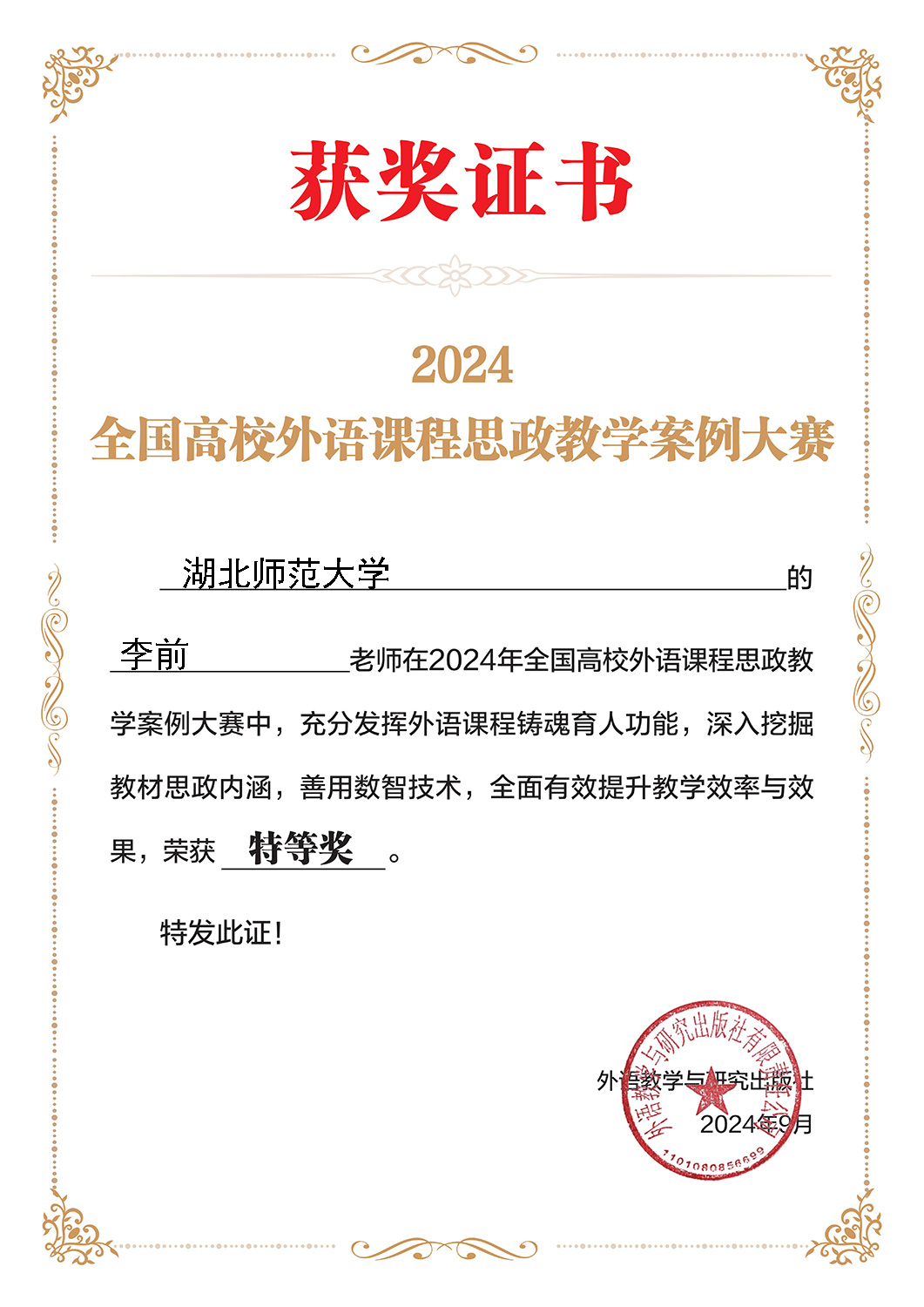 910日,正值第四十个教师节来临之际,2024年全国高校外语课程思政教学案例大赛获奖名单隆重公布。偷拍 教师李前、李端奇、姜玲和张小胜等分别获得该赛事的全国特等奖、一等奖、二等奖和三等奖。