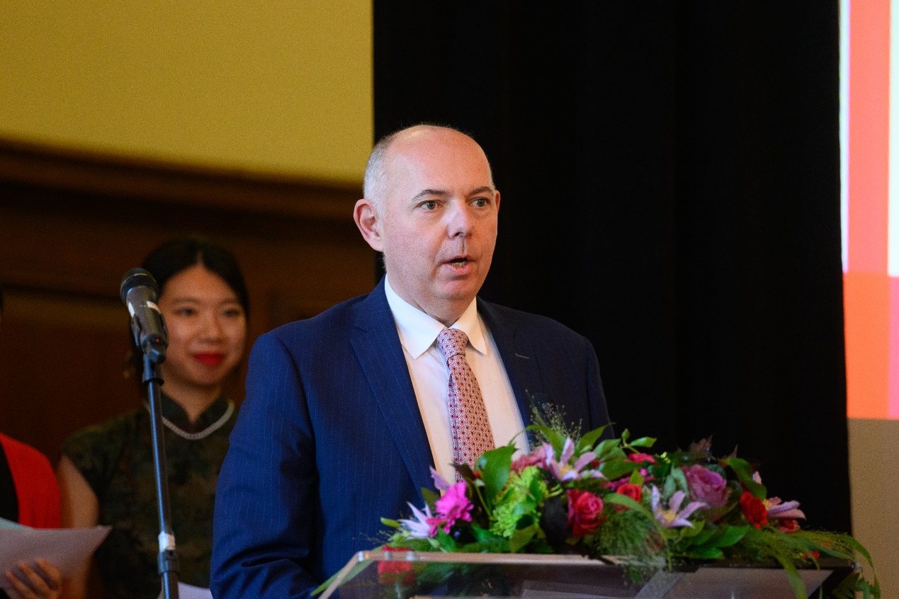 (奥斯特大学商学院院长马克·杜尔金Mark Durkin在庆典活动中致辞)