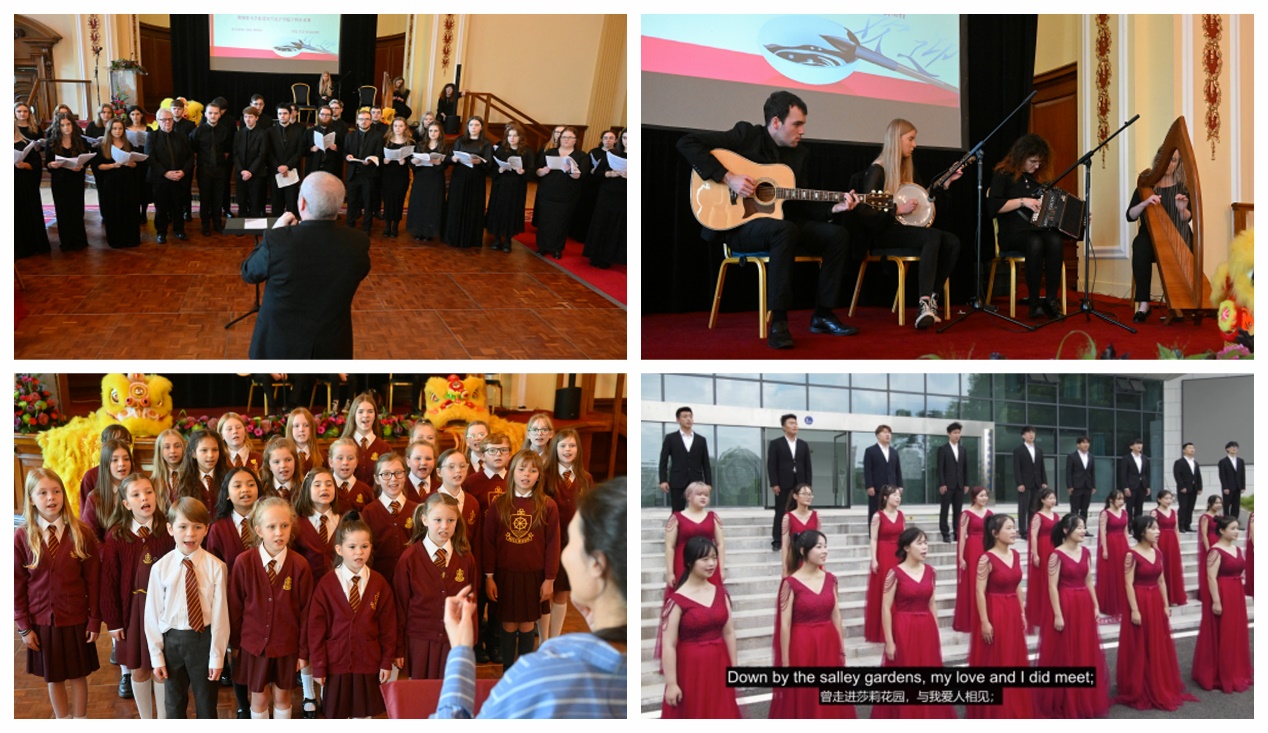 在庆典活动中,奥斯特大学合唱团、爱尔兰音乐舞蹈社团、米尔本小学合唱团的学生现场演唱了中文歌曲《我爱你,中国》《小燕子》,表演了传统爱尔兰音乐与舞蹈;偷拍 音乐学院合唱团也通过视频献上了爱尔兰歌曲《DownbytheSalleyGardens》,让现场观众欣赏到了一场中英文化交相辉映的视听盛宴。